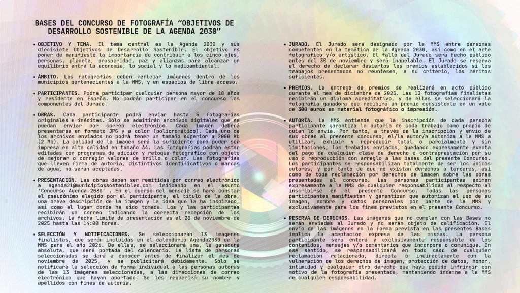 Podrá participar cualquier persona mayor de 18 años y residente en España. Cada participante podrá enviar hasta 5 fotografías originales e inéditas. Sólo se admitirán archivos digitales que se puedan enviar por correo electrónico. Cada imagen deberá presentarse en formato JPG y a color (policromático). Las obras deben ser remitidas por correo electrónico a agenda21@municipiossostenibles.com indicando en el asunto ‘Concurso Agenda 2030′. En el cuerpo del mensaje se hará constar el pseudónimo elegido por el participante, el título de la obra, una breve descripción de la imagen y la idea que la ha inspirado, así como el lugar donde ha sido tomada. La fecha límite de presentación es el 20 de noviembre de 2025 hasta las 14:00 horas.